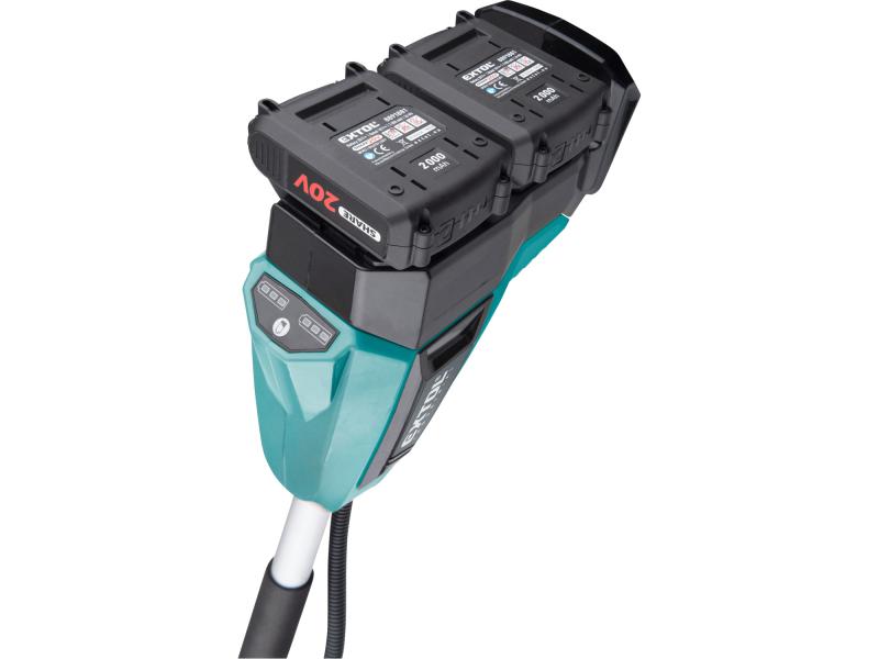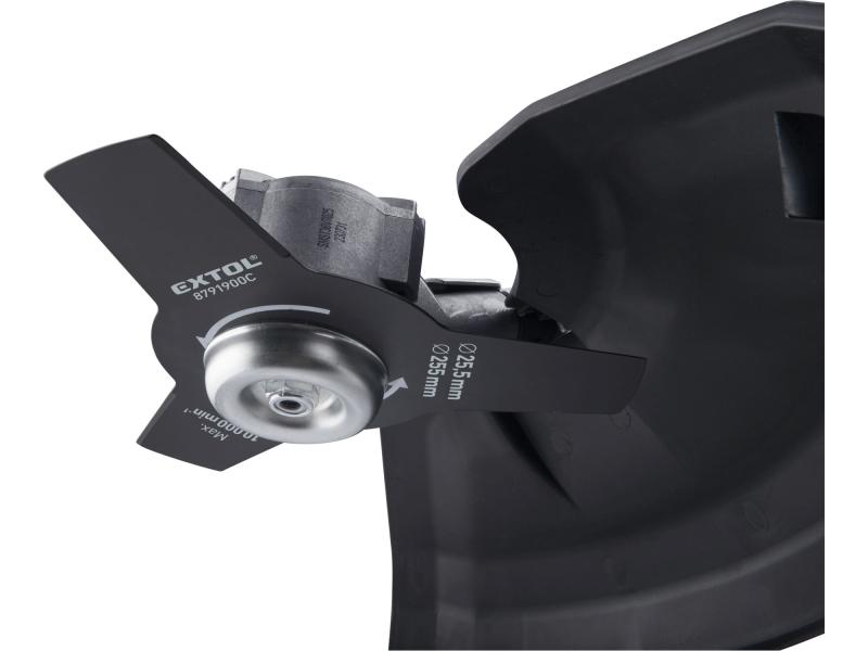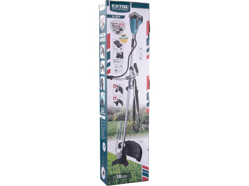 Az Extol® Industrial 8791900 erős, „kecskeszarv” fogású, damilos szegélynyíró / fűkasza, két darab 20 V-os, az Extol® SHARE 20 V programba tartozó akkumulátorral. A gépet a damilos fejjel alacsonyabb füves területek nyírásához, vagy a 3-ágú acélkés beszerelésével magas fű, gyom, vékony bokor stb. nyírásához lehet használni. A 3-ágú kés akár 4 cm átmérőjű nem túl kemény szárakat (pl. lapulevél, kisebb bokor) is elvág. A géppel nedves fű is nyírható, de a motoros fejet vízbe mártani tilos. A kis méretű, de nagy teljesítményű szénkefe nélküli „brushless” motor innovatív elhelyezésének köszönhetően (a motor közvetlenül a kaszáló fej része), nem kell a gép teljes hosszán (tengellyel vagy bowdennel) továbbítani a forgómozgást a kaszáló fejhez. A csőben csak a tápvezeték található. A gép ennek köszönhetően könnyebb, csendesebb és kisebb a rezgése is.