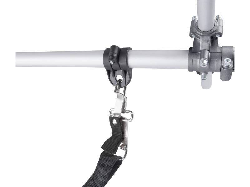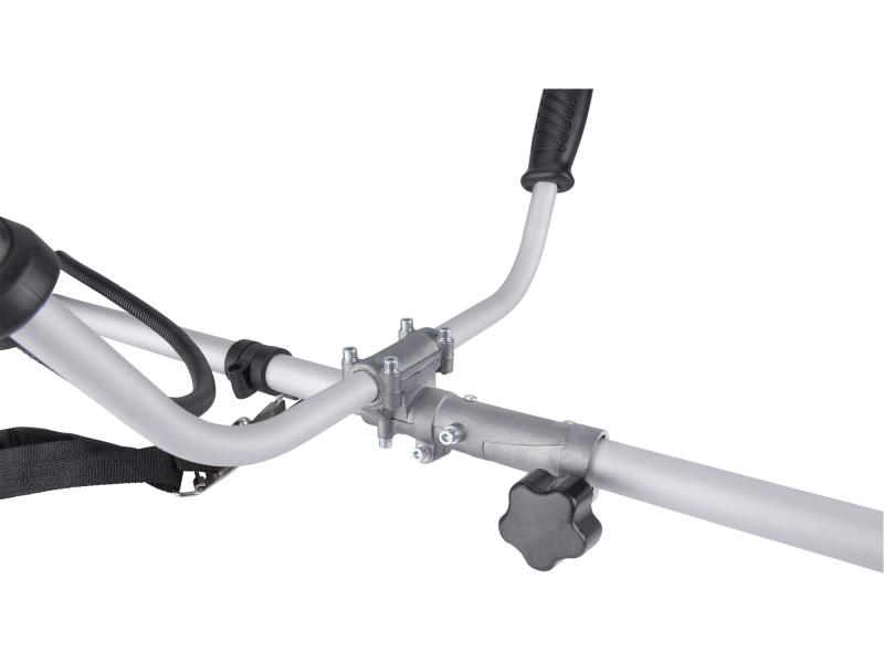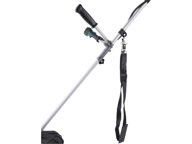- A gépet a „kecskeszarv” fogantyúval kell vezetni a füves területen. A kiegyensúlyozás megfelelő beállítása után a kezet nem terheli a gép tömege (a gép súlyát a vállra viszi át a vállszíj), így a kezekkel csak az oldalirányú oszcilláló (kaszáló) mozgást kell biztosítani.