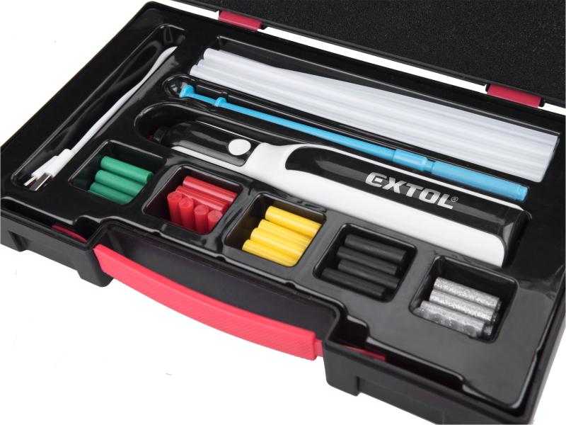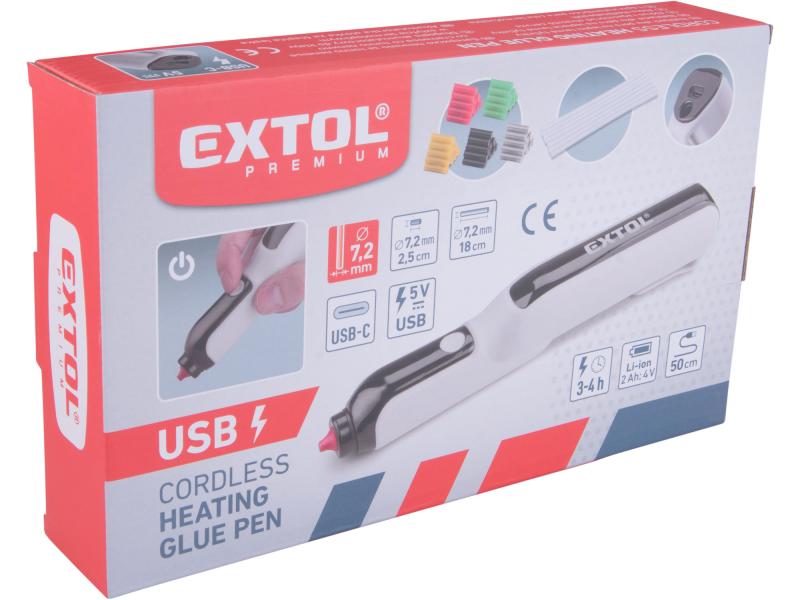Az Extol® Premium 8891503 USB-ről feltölthető akkus ragasztóolvasztó tollban motor mozgatja a ragasztórudat, A készülékkel gyorsan lehet papírt, parafát, bőrt, textíliát, műanyagokat, kerámiát stb. ragasztani. A készülékbe 7,2 mm átmérőjű ragasztórudat lehet behelyezni. A készülék háza ergonomikus és kényelmesen fogható, ugyanúgy ahogy a ceruzák, és a vékony kifolyó ragasztónak köszönhetően finom és precíz munkákhoz is használható. A készüléket szerszámos dobozban forgalmazzuk, és a készülékhez 18 cm hosszú transzparens, valamint 2,5 cm hosszú különböző színű színes ragasztórudakat is mellékeltünk. A színes ragasztórudak csak 2,5 cm hosszúak, hogy könnyeben cserélhesse azokat és különböző színekkel tudjon ragasztani.