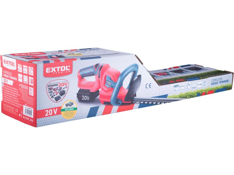 Az Extol® Premium 8891933 akkus sövénynyírót akkumulátor és akkumulátortöltő nélkül forgalmazzuk, így kedvező áron vásárolható meg a készülék, ha a vevőnek már van más, tőlünk származó SHARE 20 V-os akkus készüléke, kompatibilis akkumulátorral és akkumulátortöltővel.