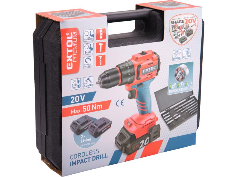 A kicsi de erős, szénkefe nélküli („brushless”) motorral szerelt 8891806 Extol® Premium akkus fúró-csavarozóval (ütvefúróval) ütés nélkül lehet csavarozni és fúrni (fába, műanyagba, acélba és más fémekbe), valamint az ütés bekapcsolásával falba is lehet fúrni. A fúrógép rövid feje lehetővé teszi a készülék szűk helyeken való használatát is. A LED munkahely megvilágító lámpa nem kapcsol ki azonnal a működtető kapcsoló elengedése után, egy ideig még lámpaként lehet használni a fúrás után is.