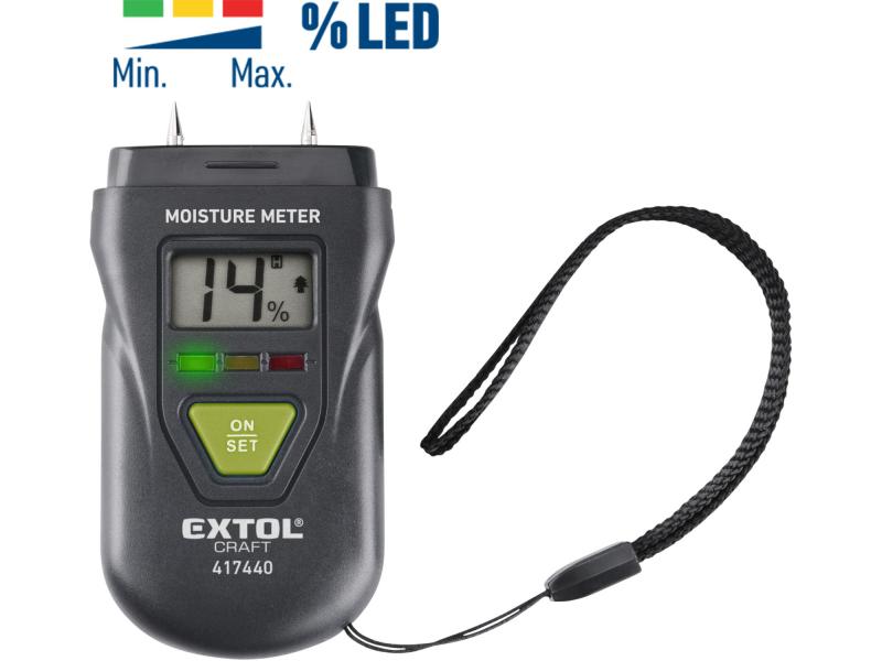 Mérési tartomány: Fa: 6-60%, Építőanyag (pl. beton): 0,2-2,9%