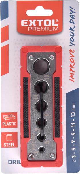 Műanyag ház, 6 db rozsdamentes acél megvezető hüvely: 3 - 5 - 7 - 9 - 11 - 13 mm fúrószárakhoz.