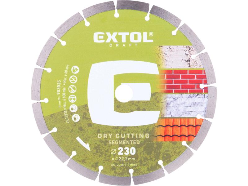 A kiváló minőségű gyémántvágó korongok nagy teljesítményű szerszámok melyek alkalmazásuk során nagy igénybevételnek vannak kitéve, alkalmasak félprofesszionális és otthoni, barkács jellegű felhasználásra. Az Extol Craft gyémántvágó korongok megbízható, általános felhasználású vágószerszámok, melyek megfelelő biztonságot garantálnak Önnek a munkavégzés során A gyémántvágó korongot beton, tégla, cserép, téglafal, kő, gránit vágásra lehet használni. A megfelelő használatát a termék melletti tájékoztatóban olvashatja.
