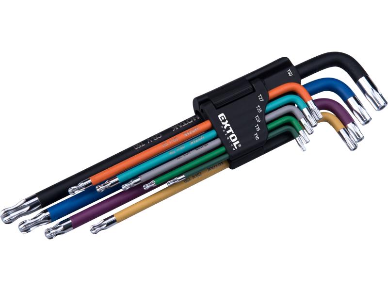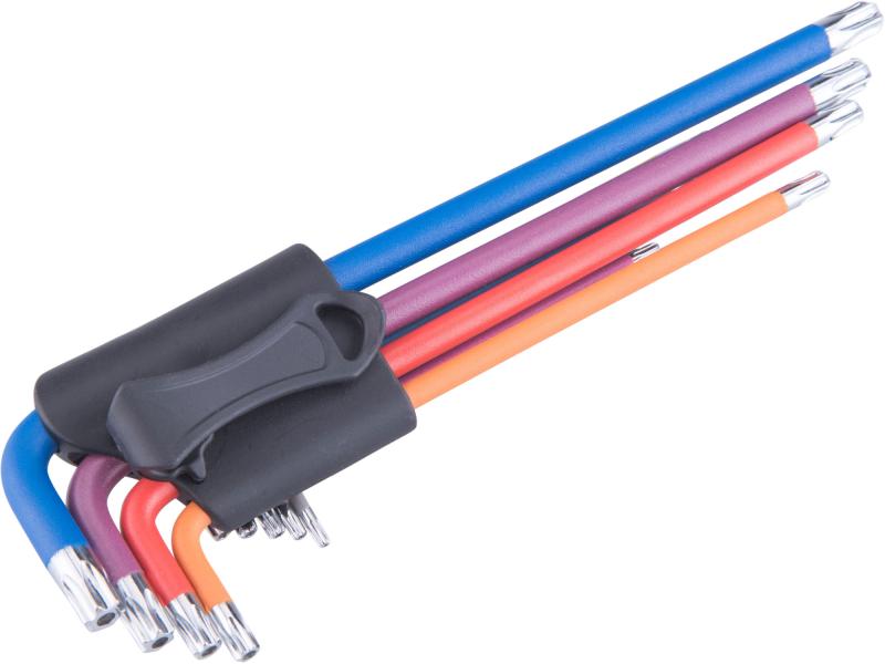 torx kulcs klt., 9db, több színű, extra hosszú, T10-T50, hosszú szár: tömör/gömbfej, rövid szár: lyukas, S2, krómozott