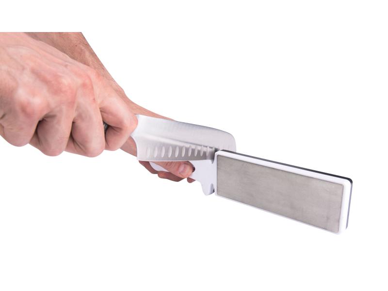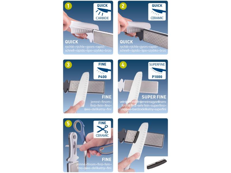 Késhez és ollóhoz is használható, 5-funkciós.Műanyag-kerámia vezetővel van ellátva, amely segít fenntartani az állandó penge-csiszolási szöget az élezés során. Két további nyílás/kamra van beépítve a nyél felső részébe a "durva" élezéshez egy pár keményfém betéttel és a finom végső élezéshez kerámia betétekkel. Ezen kívül a fogantyú belsejében is van egy dupla nyílás/kamra olló élezéséhez kerámia lemezekkel.