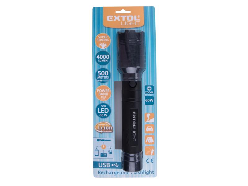 LED lámpa, 60 W COB LED; 4000 Lm, ALU ház, zoom, USB újratölthető Li-ion akkus, 4000 mAh, Power Bank funkció