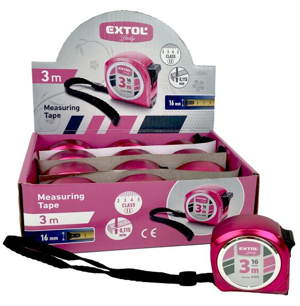 mérőszalag, gumírozott, 1 stoppos; rózsaszín, 3m×16mm, Extol Lady