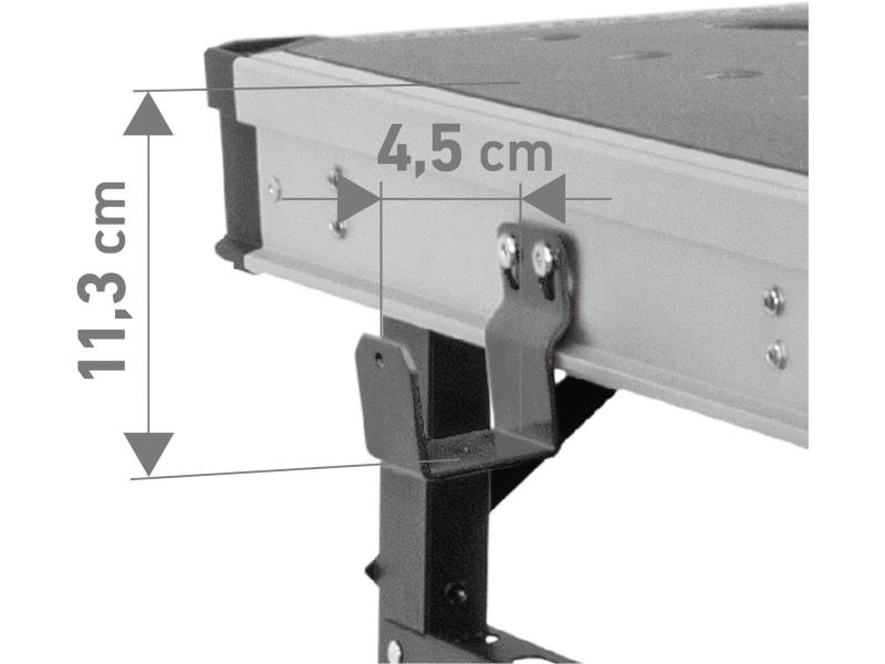 - az alumíniumkeretbe foglalt MDF-lemezzel ellátott masszív fém alapszerkezet 850×600 mm-es munkaterületet biztosít 450 kg teherbírással, számos kivágással és 20 mm-es furatokkal mind a mellékelt ütközők, mind az esetleges rögzítőbilincsek, szorítók számára: 4 db megállító/ütköző, 3 db tároló rekesz, 2 db U-alakú oldalsó rögzítő/csatlakozó elem, 2 db sarok csatlakozó.