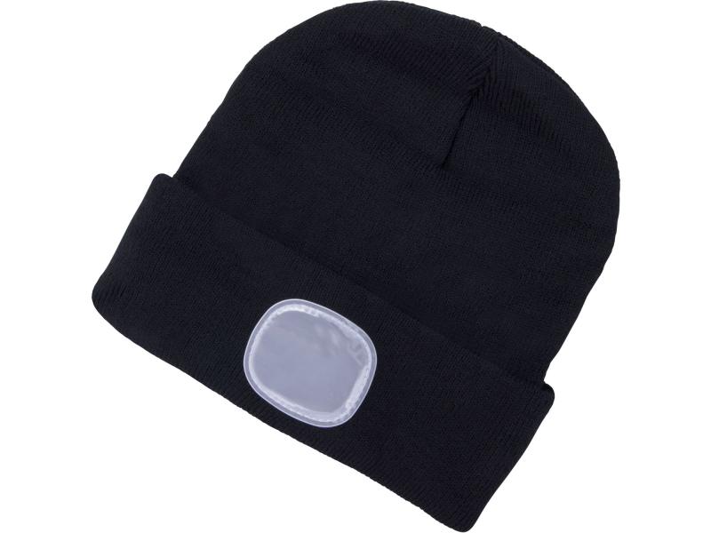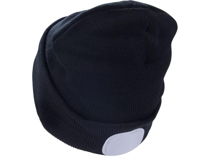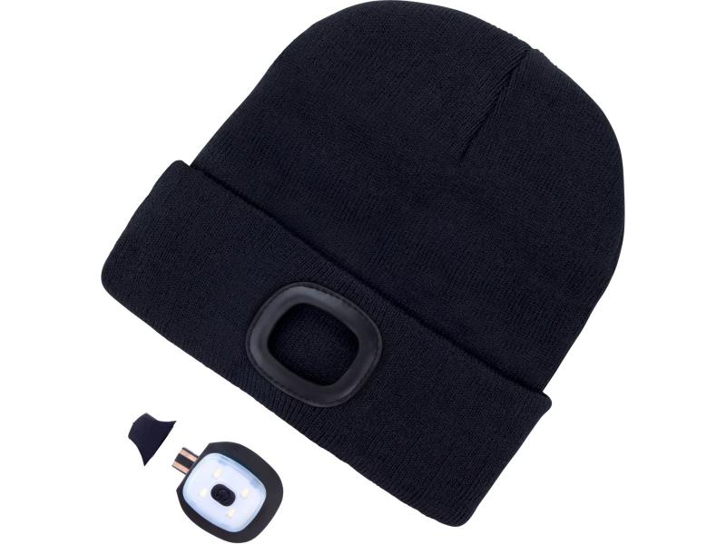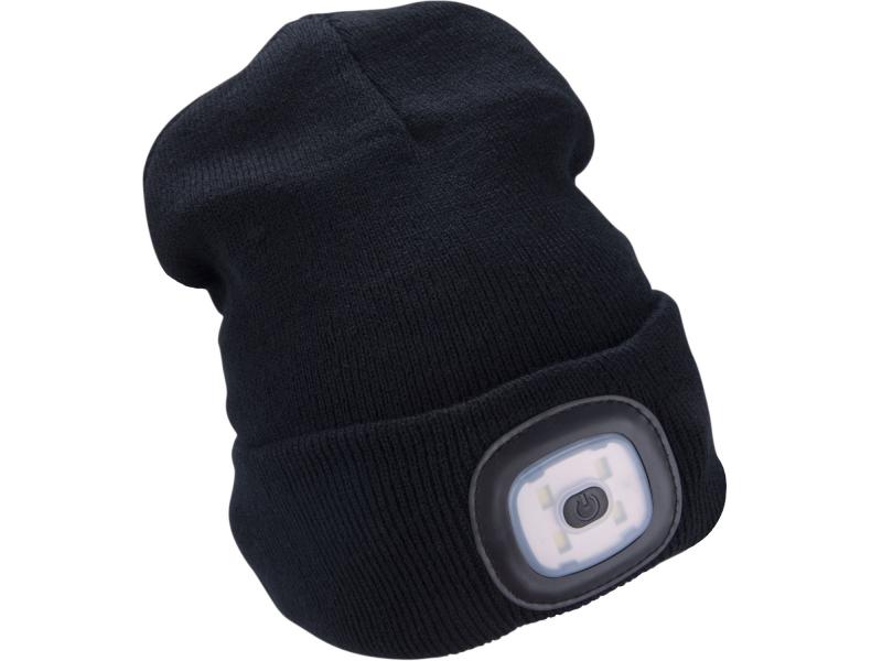 sapka, fekete, kötött, kivehető LED homloklámpával, 4×45 Lumen; USB tölthető Li-ion, 3funkció (100%-75%-50% fénye.)