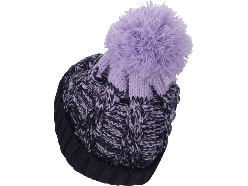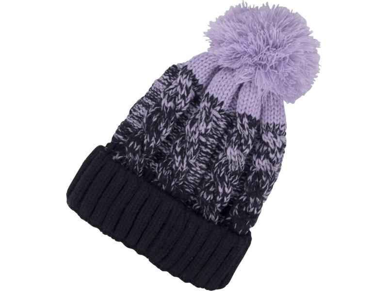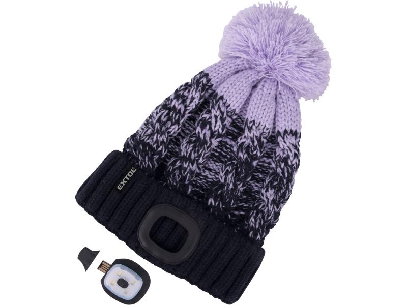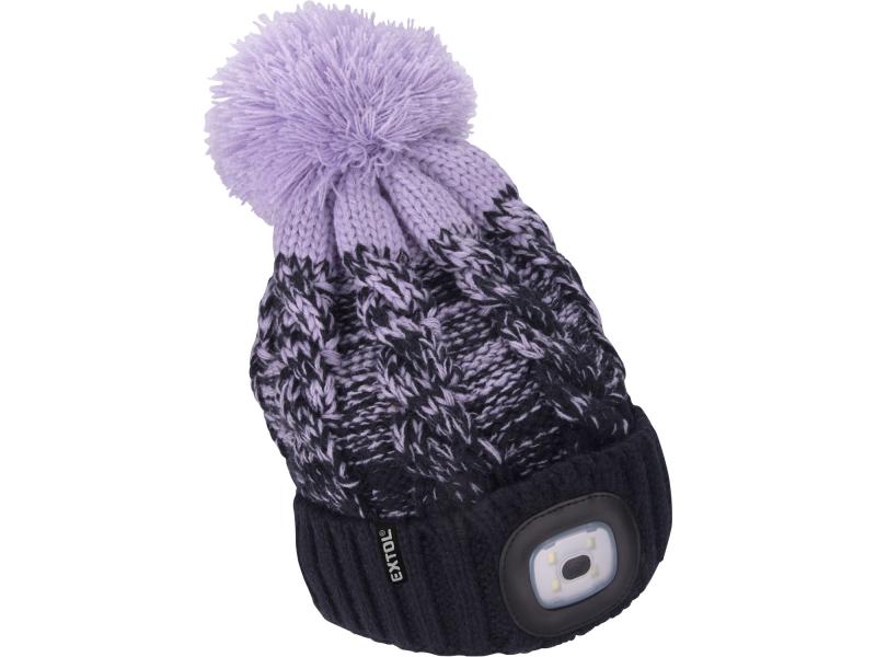 sapka, kék/lila pomponnal, kötött, kivehető LED homloklámpával, 4×45 Lumen; USB tölthető Li-ion, 3funkció (100%-75%-50%)