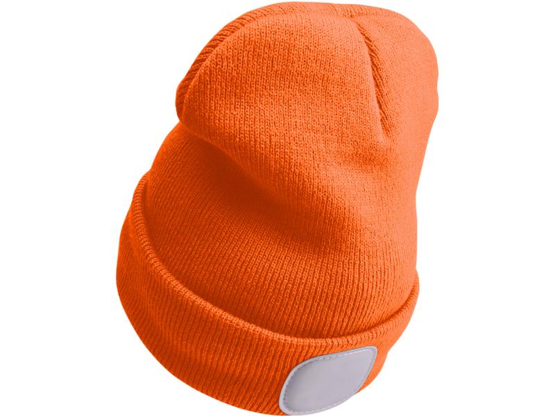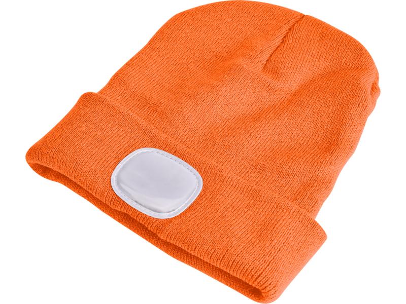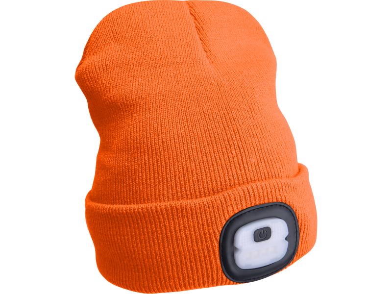 sapka, neon-narancs, kötött, kivehető LED homloklámpával, 4×25 Lumen; USB tölthető Li-ion akku, 3funkció (100%-75%-50%)