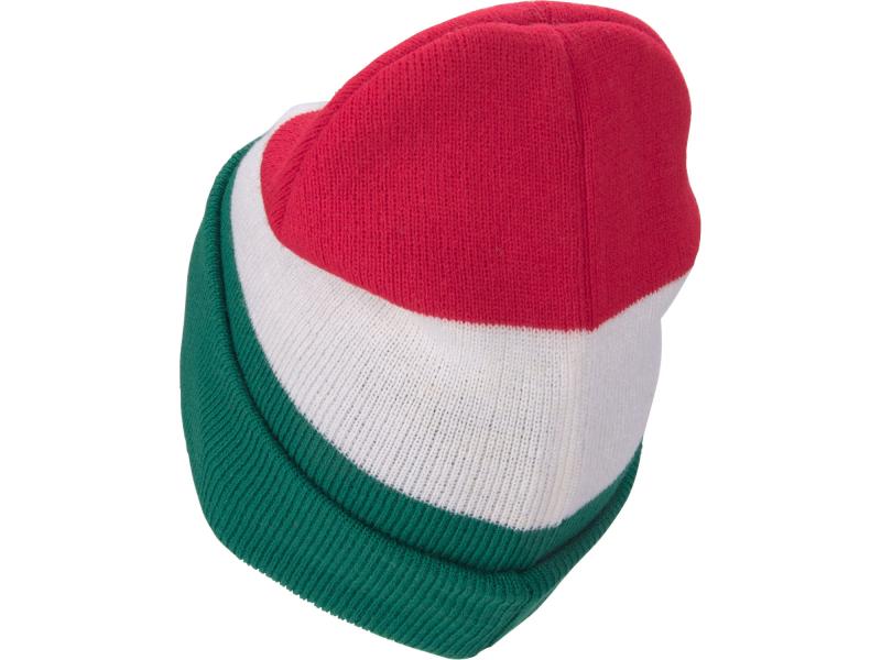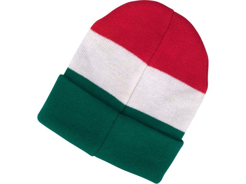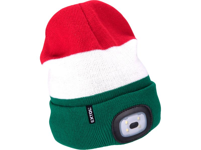 sapka, piros/fehér/zöld, kötött, kivehető LED homloklámpával, 4×45 Lumen; USB tölthető Li-ion, 3funkció (100%-75%-50%)