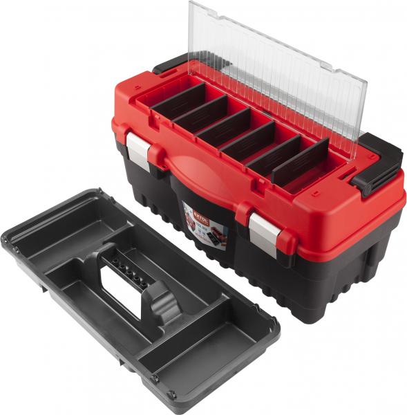 szerszámosláda, m?anyag 547×271×278mm, fémcsatos, tálcával, lakatolható, ALU nyél